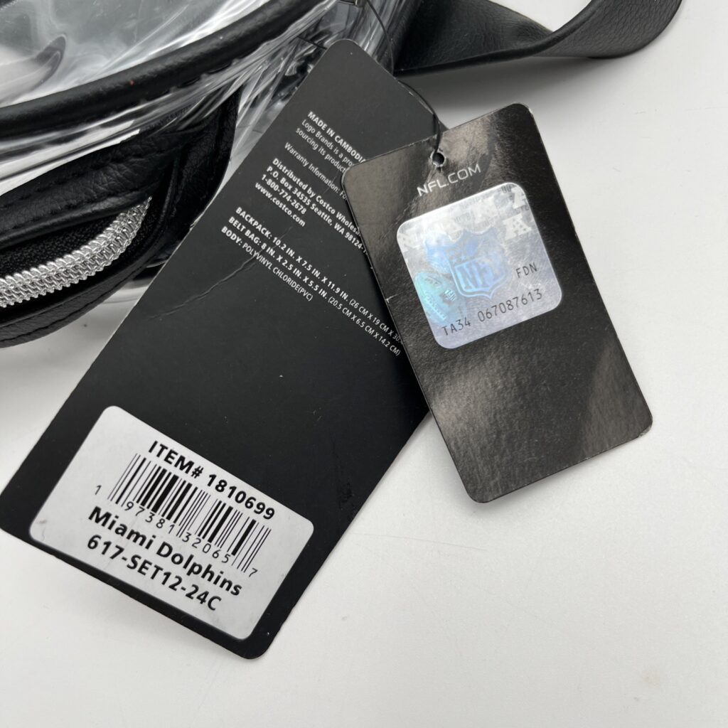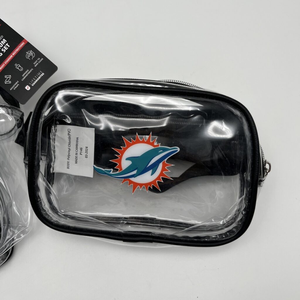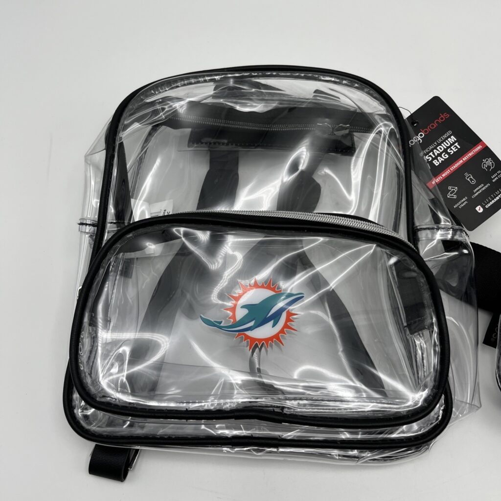 NFL Miami Dolphins football team fans will enjoy this sturdy, spacious, and stylish clear mini backpack and fanny pack/waist bag set. Perfect for any stadium event or game, theme parks too, to carry your belongings.
